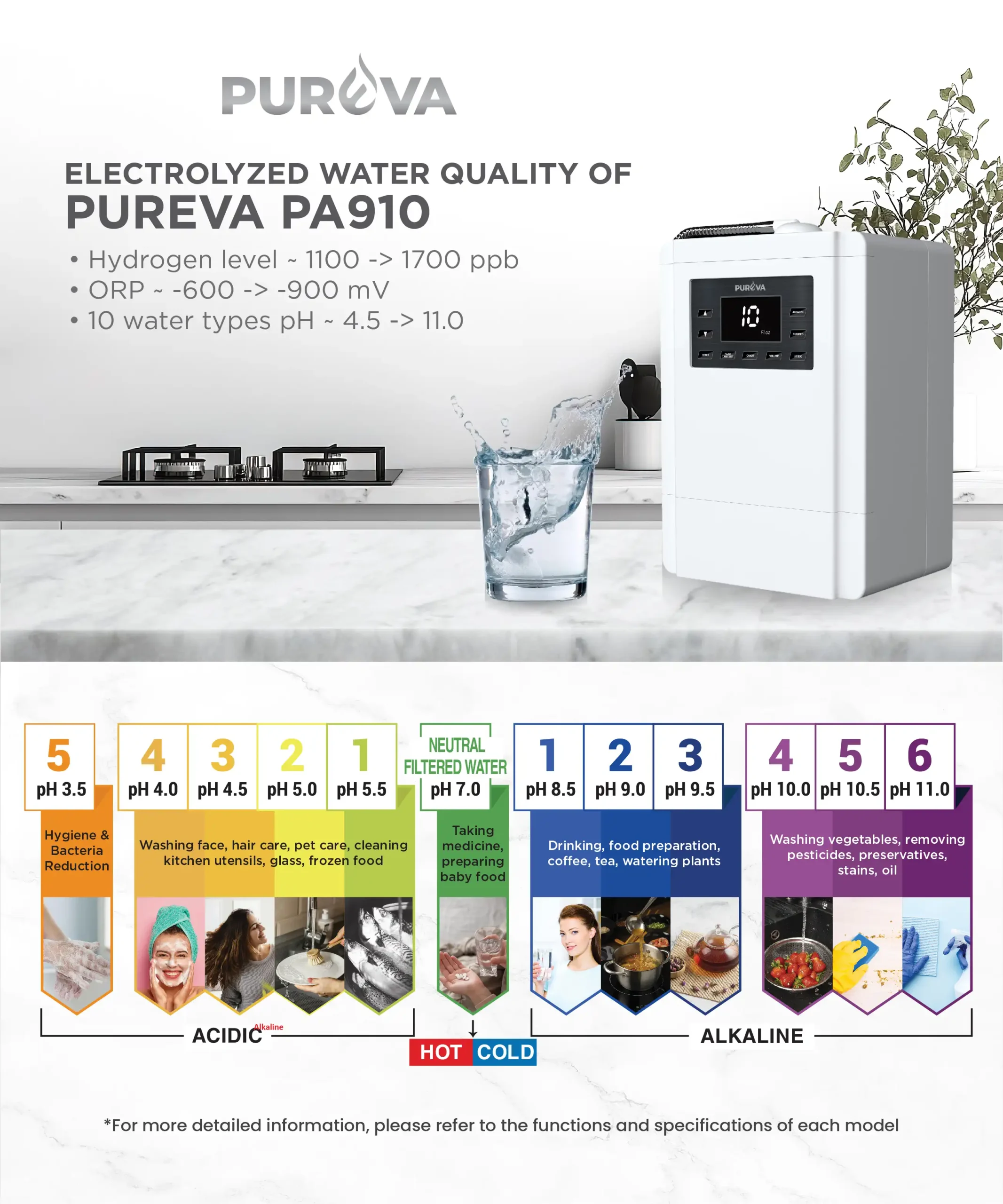 This product not only meets the need for clean water but also enhances the user experience with smart features and superior performance. Let's explore the details of the PUREVA PA910, including its advanced electrolysis technology, specialized filtration system, optimal ORP and Hydrogen indexes, multiple water uses, and outstanding utility design.