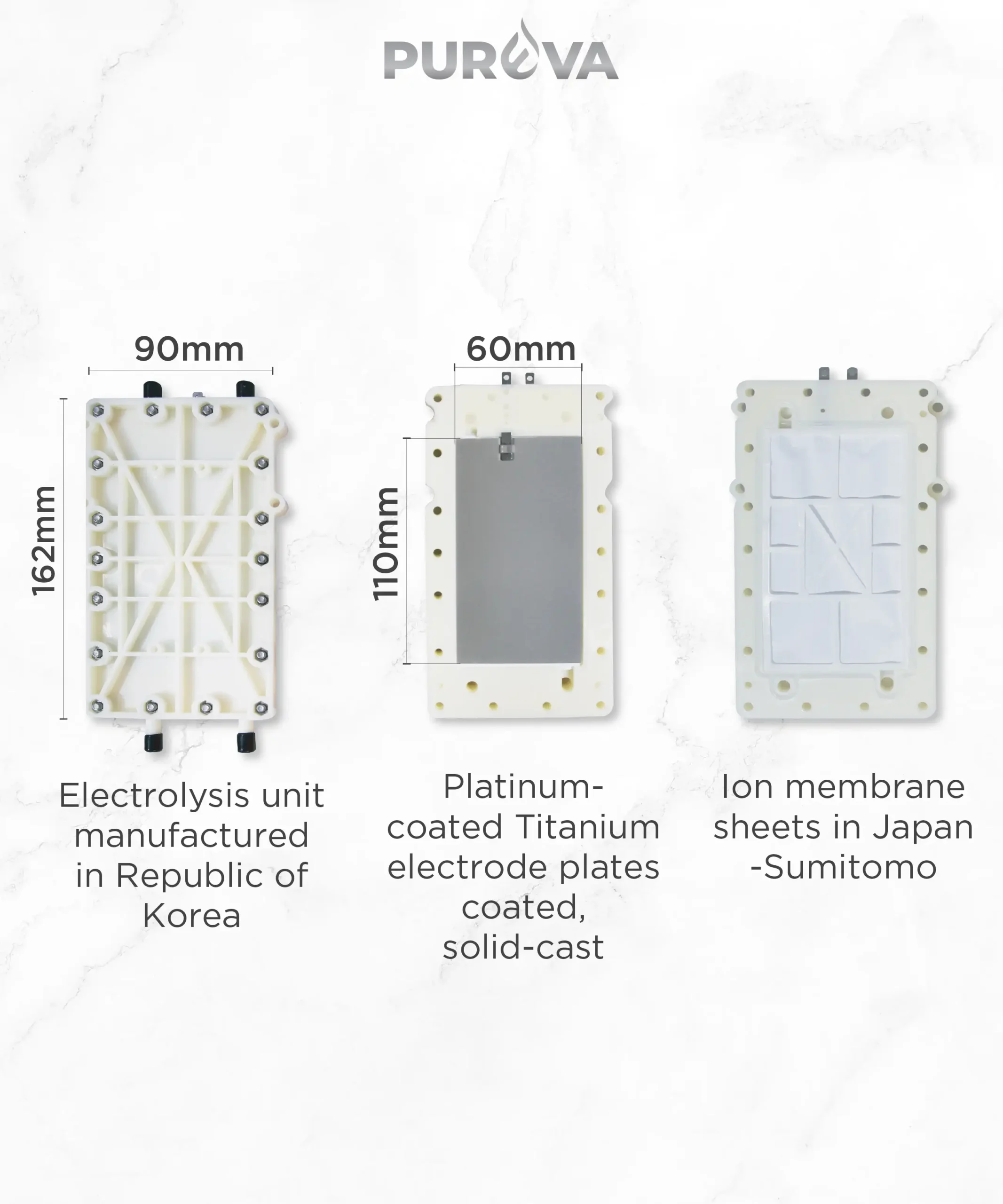 The heart of the ROBOT PUREVA PA910 alkaline ionized water purifier is its high-quality electrolysis unit, featuring 9 solid, flat Platinum- coated Titanium electronic plates, manufactured directly in Republic Korea. These plates have a large surface area of 60mm x 110mm and are combined with an ion-exchange membrane sheets from Sumitomo (Japan), ensuring efficient water molecule separation. The flat plate structure increases the contact area, optimizing the electrolysis process to produce various kinds of high-quality ionized water.