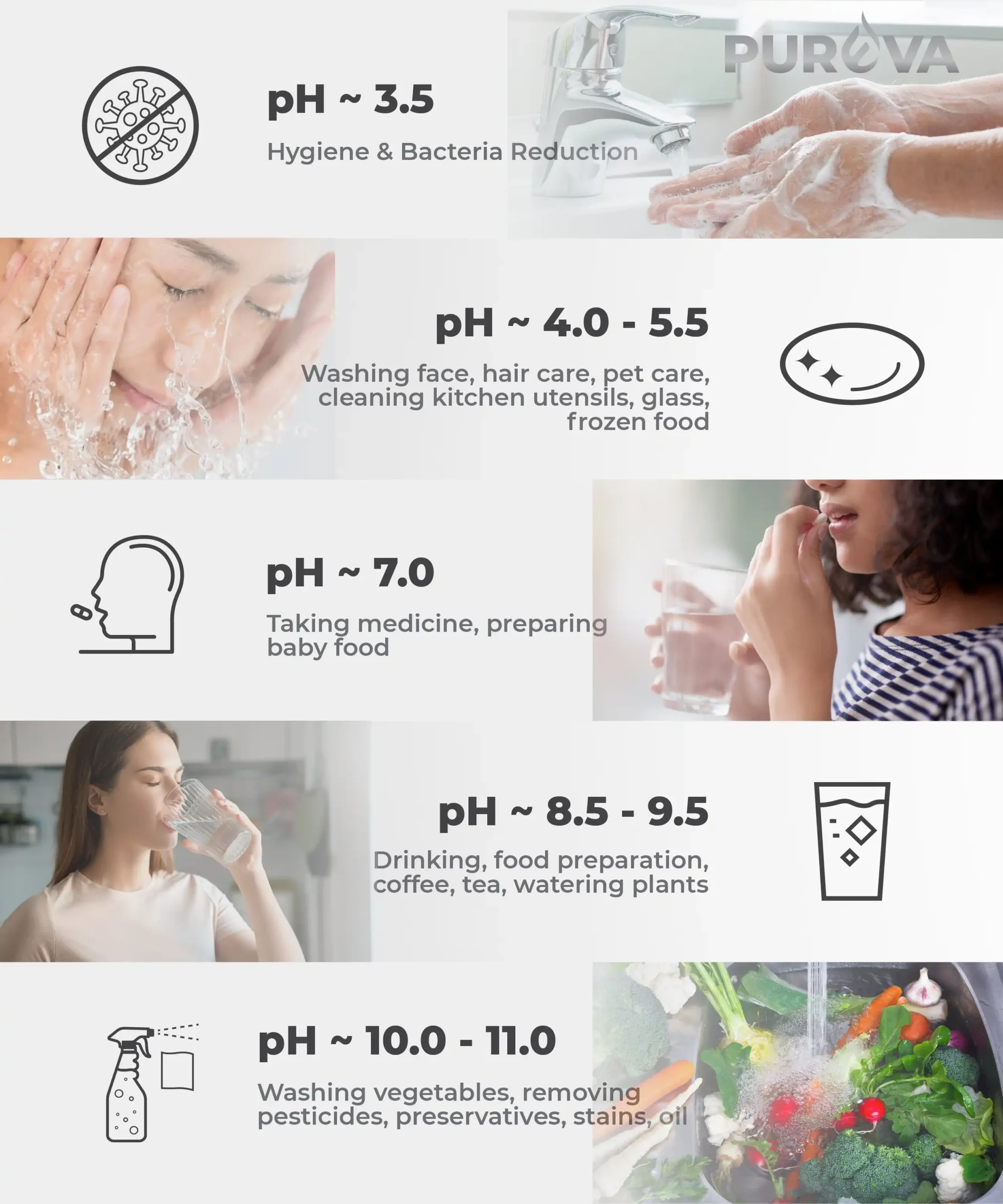 The PUREVA PA910 is designed to generate up to 10 kinds of water with a wide pH range from ~4.5 to 11.0, including: