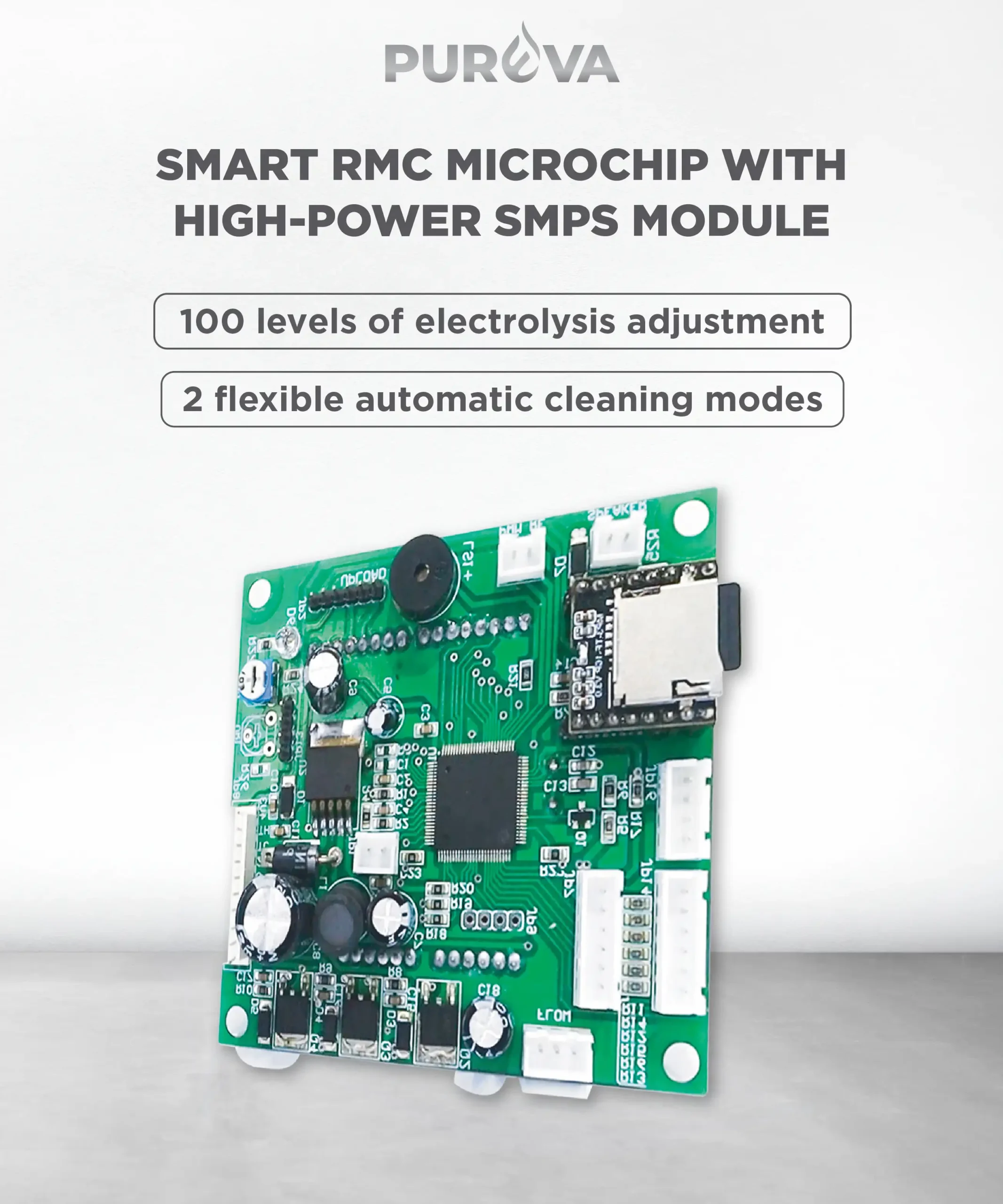 The PUREVA PA910 proudly integrates RMC technology with an SMPS power supply, providing a powerful operating system that adjusts electrolysis intensity, ensuring uniform and stable water treatment at every stage.