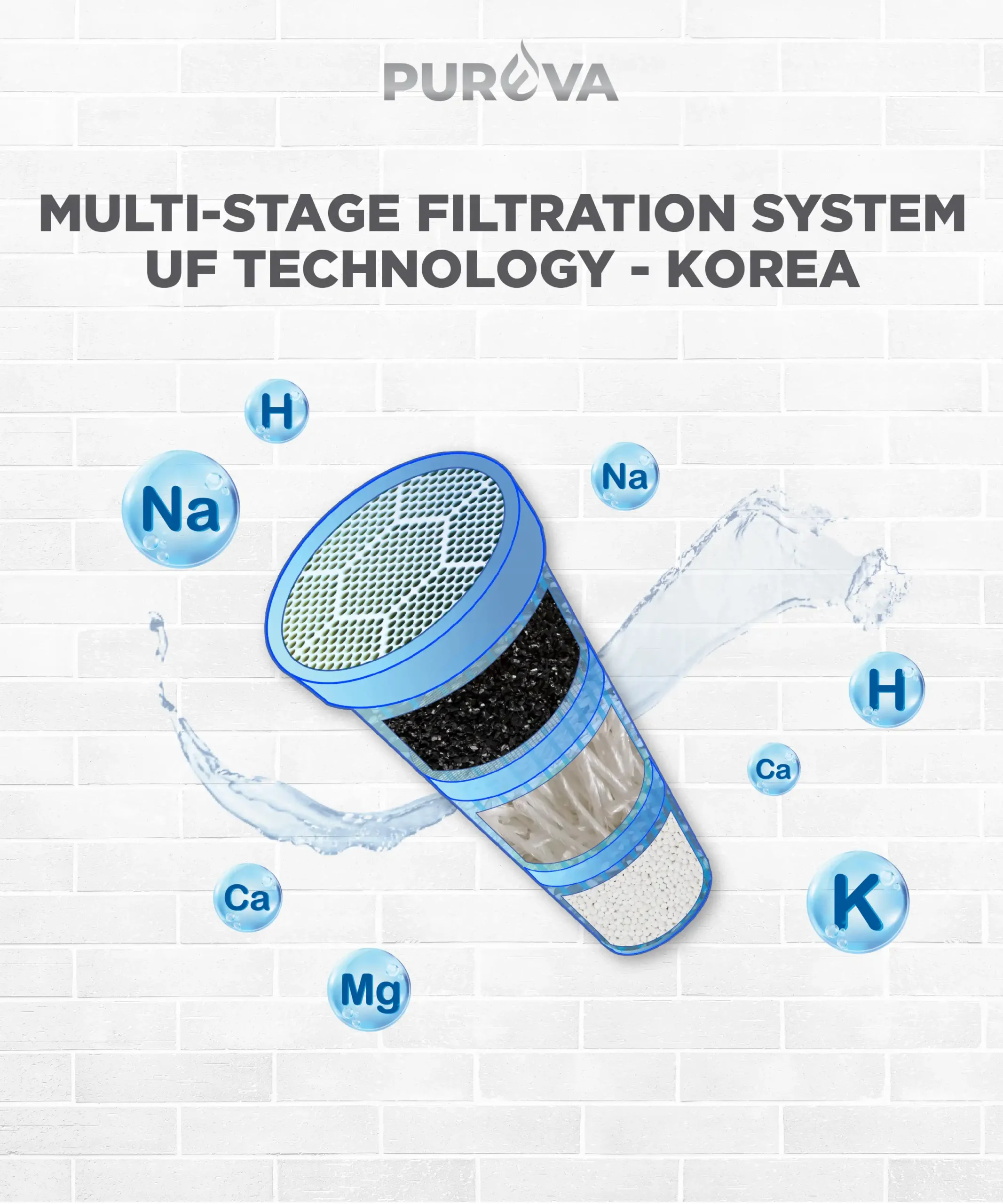 The PUREVA PA910 uses UF (Ultrafiltration) technology from Korea, which is specialized in the international water filtration industry. The filter structure includes: